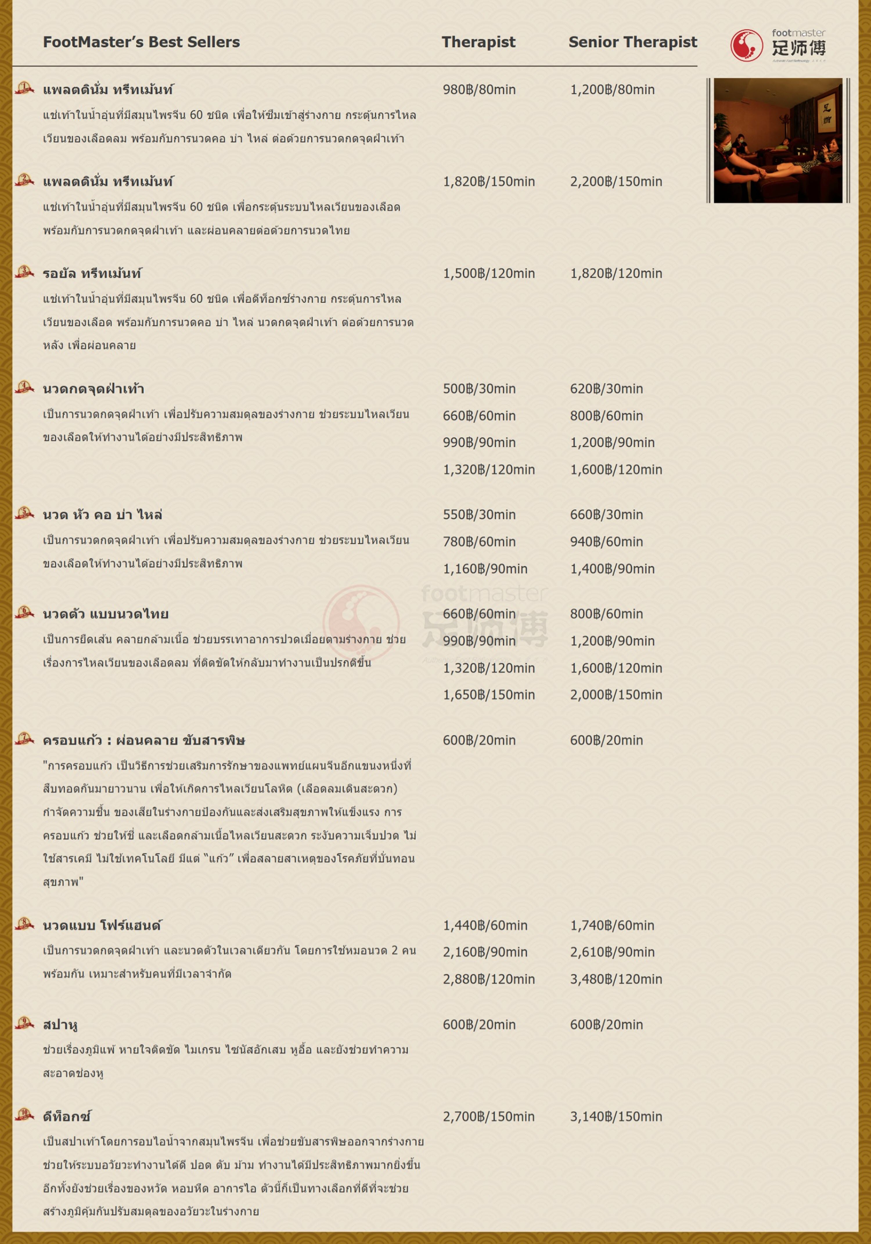 Founded in June 2010, FootMaster was started by 3 foot massage lovers in the pursuit of authentic foot reflexology in Thailand. After trying out different Foot Treatments in Various Parts of The World, these were frustrated by The Local Lovers Thai Foot Massage Techniques (Stick-poking Techniques, Soft Touch Techniques, etc). They were Determined to introduce 'Authentic Foot reflexology' Into Thailand. FootMaster is strategically located on the 3rd floor of Amarin Plaza and Soi Sukhumvit 31. Amarin Plaza is surrounded by many 5 STAR HOTELS (Grand Hyatt, Intercontinental, Holiday Inn, Four Season, etc) and is easily accessible by BTS (Chidlom).