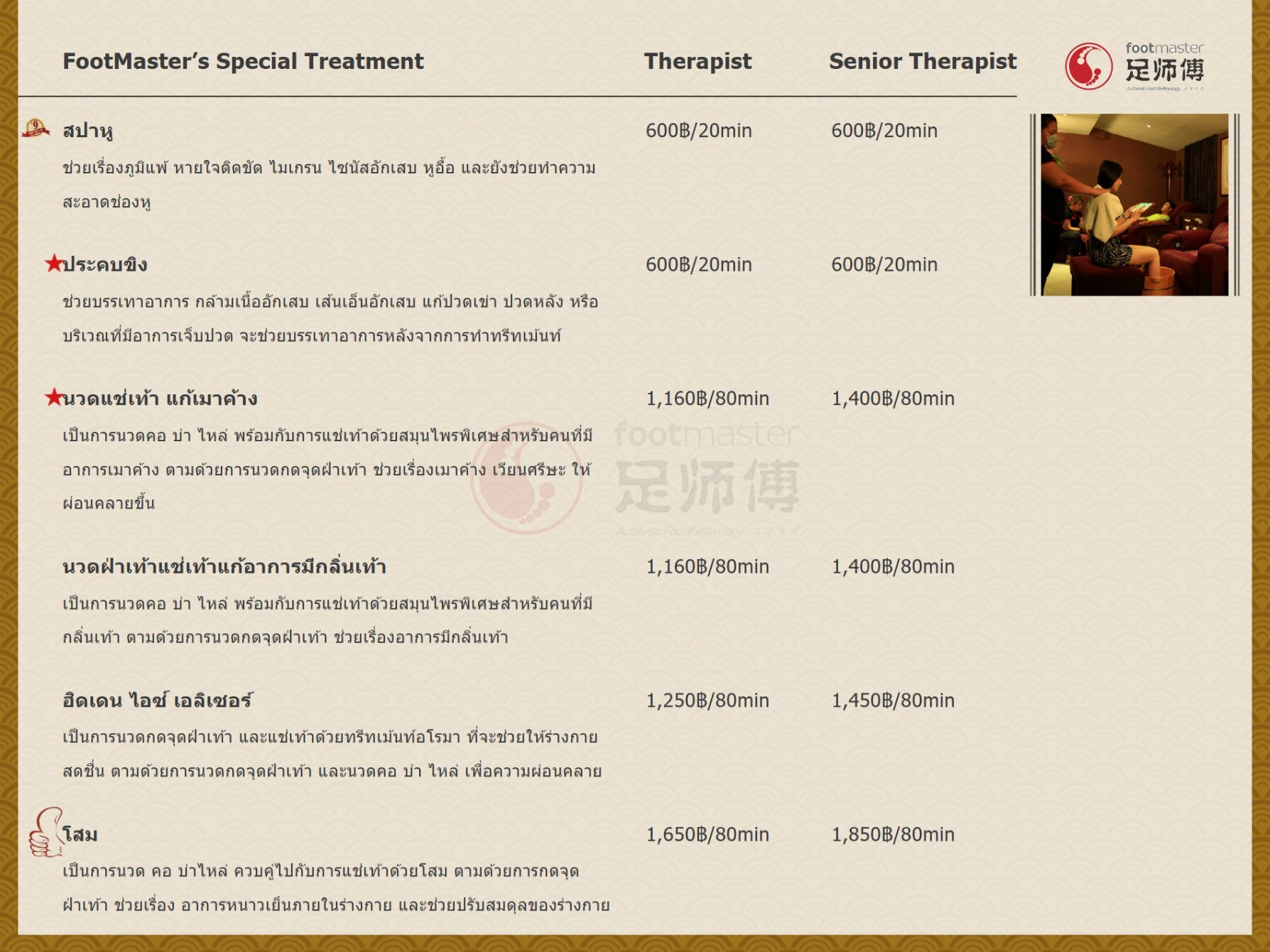 Founded in June 2010, FootMaster was started by 3 foot massage lovers in the pursuit of authentic foot reflexology in Thailand. After trying out different Foot Treatments in Various Parts of The World, these were frustrated by The Local Lovers Thai Foot Massage Techniques (Stick-poking Techniques, Soft Touch Techniques, etc). They were Determined to introduce 'Authentic Foot reflexology' Into Thailand. FootMaster is strategically located on the 3rd floor of Amarin Plaza and Soi Sukhumvit 31. Amarin Plaza is surrounded by many 5 STAR HOTELS (Grand Hyatt, Intercontinental, Holiday Inn, Four Season, etc) and is easily accessible by BTS (Chidlom).